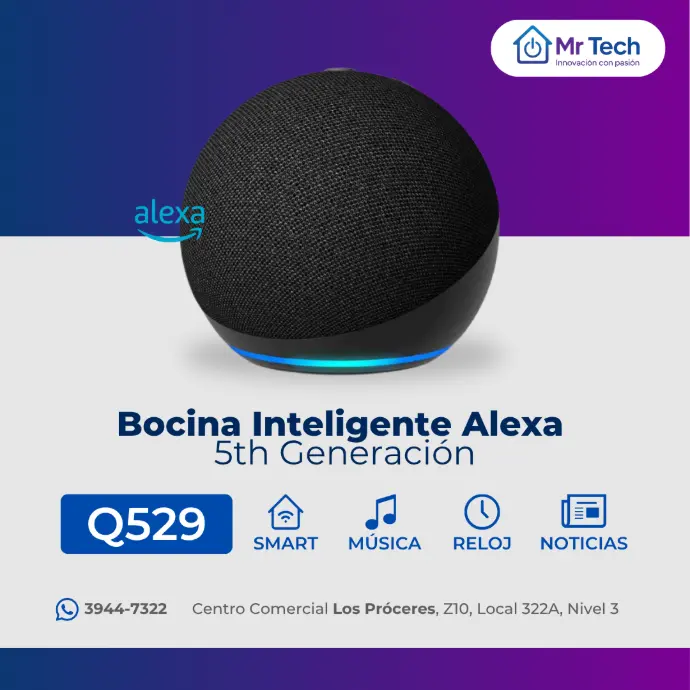 La tecnología que mejora tu día a día. Controla tu hogar, escucha música y mantente informado con la Bocina Inteligente Alexa 5th Gen. Conéctate al futuro, hoy.